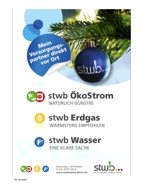 VpearrsMtovneoregirrnuOdnirrgtesk- t stwb ÖkoStrom NATÜRLICH GÜNSTIG stwb Erdgas WÄRMSTENS EMPFOHLEN stwb Wasser EINE KLARE SACHE Wiesenweg 1 | 36179 Bebra Telefon 06622 9245-0 www.stadtwerke-bebra.de 24 | das beste!